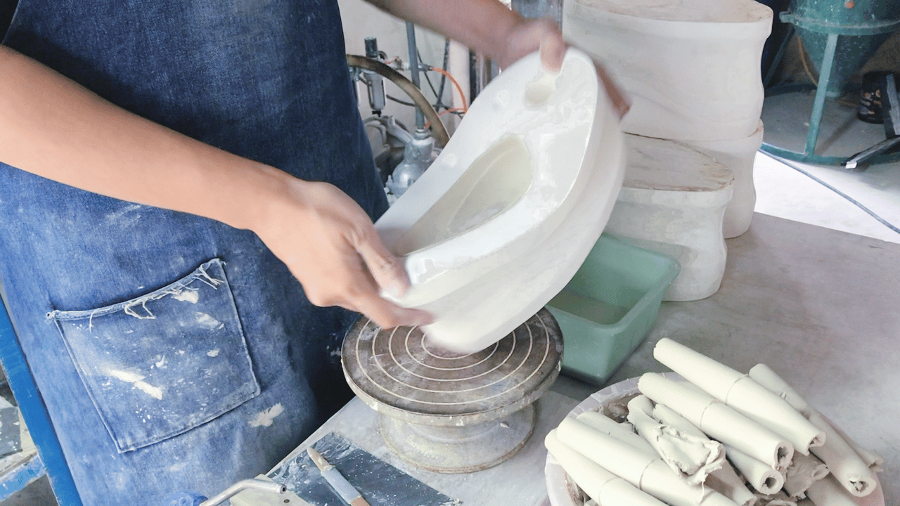 by a master ceramist from Taiwan. The process involves precise molding, manual pouring, demolding, and refining, followed by multiple firings in a traditional kiln. This careful craftsmanship results in a flawless and elegant finish.