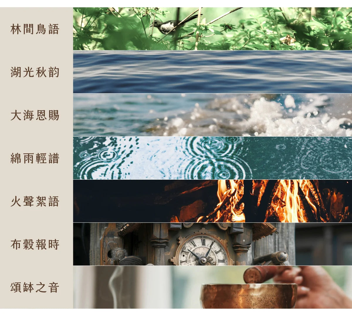 從林間鳥語,到靜心頌缽,【 WHISPER 靜眠燈 】精選了七種療癒聲,讓您可依心情或天氣變化,選擇最適合的靜心之音。